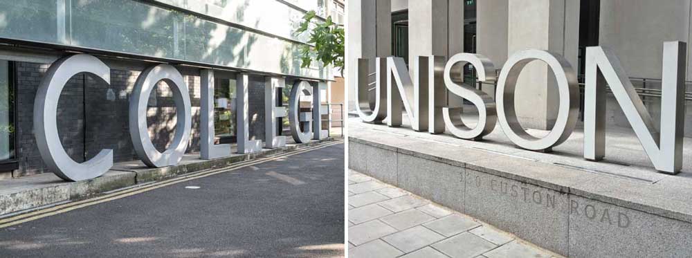 Contrast this with the lettering for the trade union Unison, outside their Euston Road headquarters. They faced the same problem: but instead of sinking the letters, they raised them all up on short poles. The supports for the N and I are slightly shorter than those for U, S and O, to give all the letters the correct optical heights.